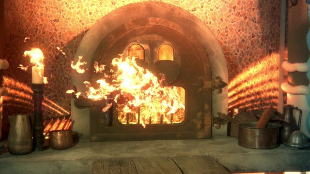 Ma Gretel la spinge nel forno e lei e il fratello scappano con la mela; Regina, che stava guardando tutta la scena con il suo Specchio Magico, crea una fiammata e la invia nel forno spento dove si trova la Strega, che viene colpita dalle fiamme e muore arsa viva tra grida strazianti.